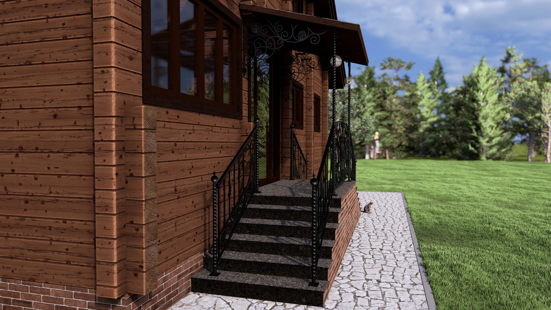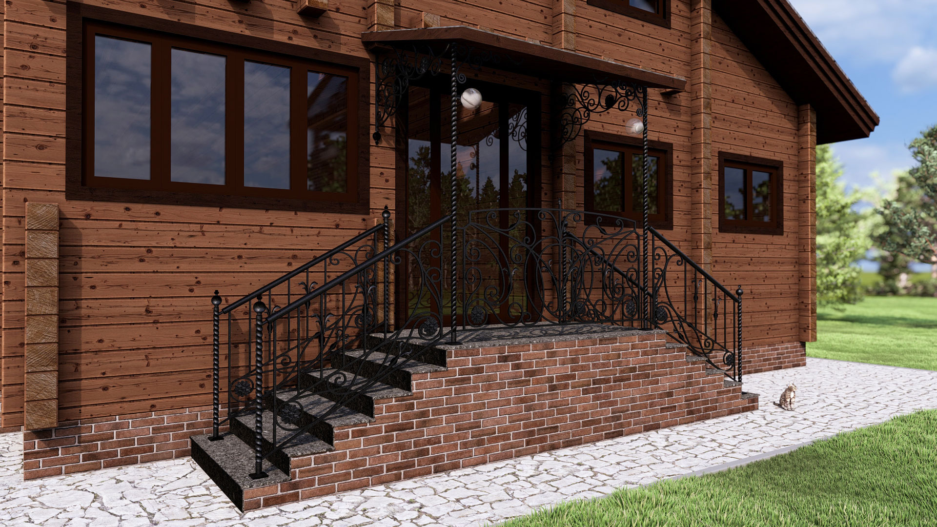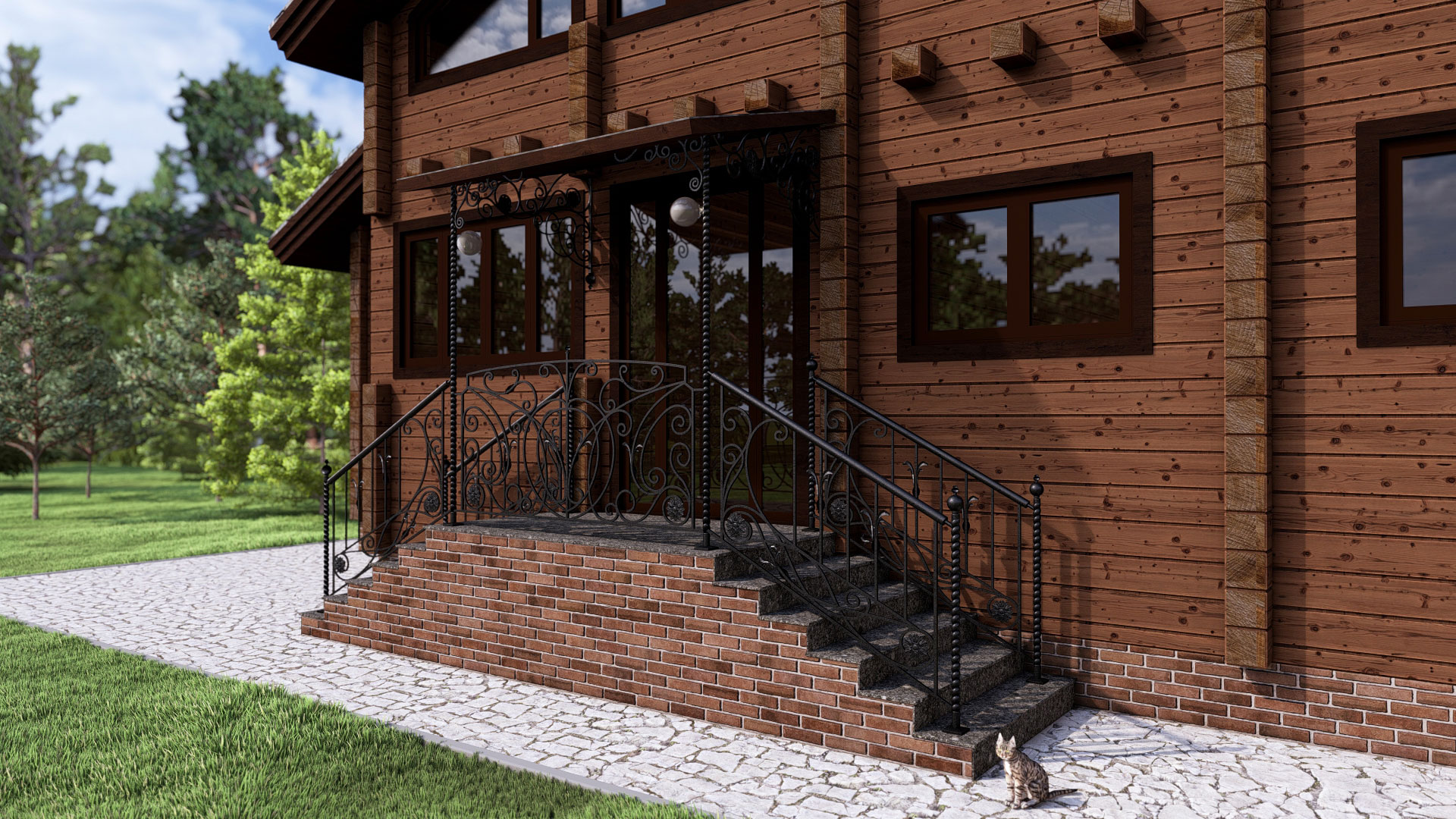 Разработка дизайн проекта крыльца с кованными перилами для индивидуального дома.